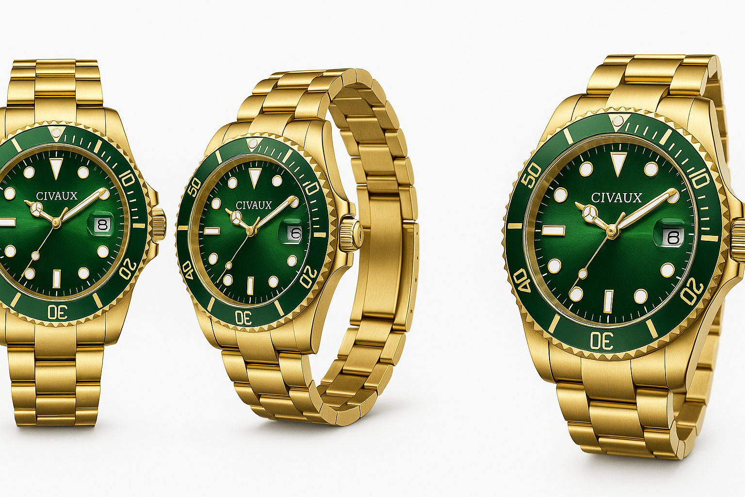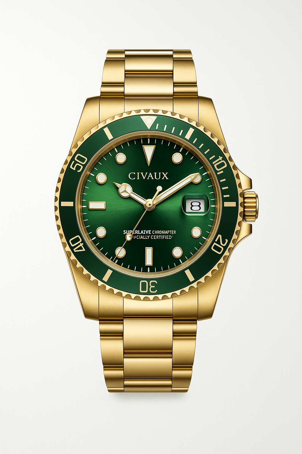 The Civaux Emeraude | Gold Edition is a bold fusion of prestige and precision. With its rich emerald green dial, rotatable bezel, and polished gold stainless steel construction, this timepiece delivers effortless power and elegance in one refined design.