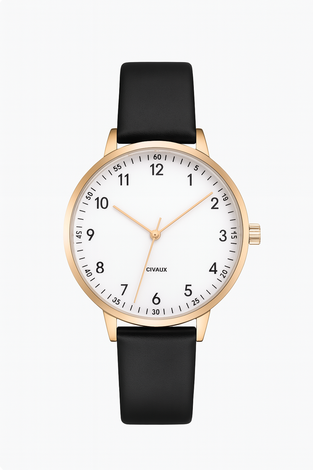 A smooth black leather strap meets a rose gold case and crisp white dial — refined minimalism at its finest.